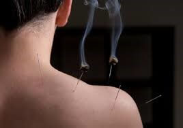 2. Moxa: Constă în aplicare căldurii pe punctele de acupunctură. Aplicarea moxei poate fi directă (se pune un con din frunze de pelin pe punctul vizat și se aprinde, acesta arzând mocnit). Moxa directă are o utilizare limitată din cauza cicatricilor care se pot produce. Moxa indirectă se realizează prin interpunerea unei felii de ghimbir sau usturoi între conul de frunze de pelin și piele, sau prin menținerea la o oarecare distanță de piele a unui baton aprins din frunze de pelin.